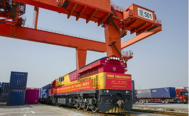 The land-sea freight train of the New International Land-Sea Trade Corridor heading for Indonesia waits to depart in southwest China's Chongqing, April 26, 2019. (Xinhua/Liu Chan)