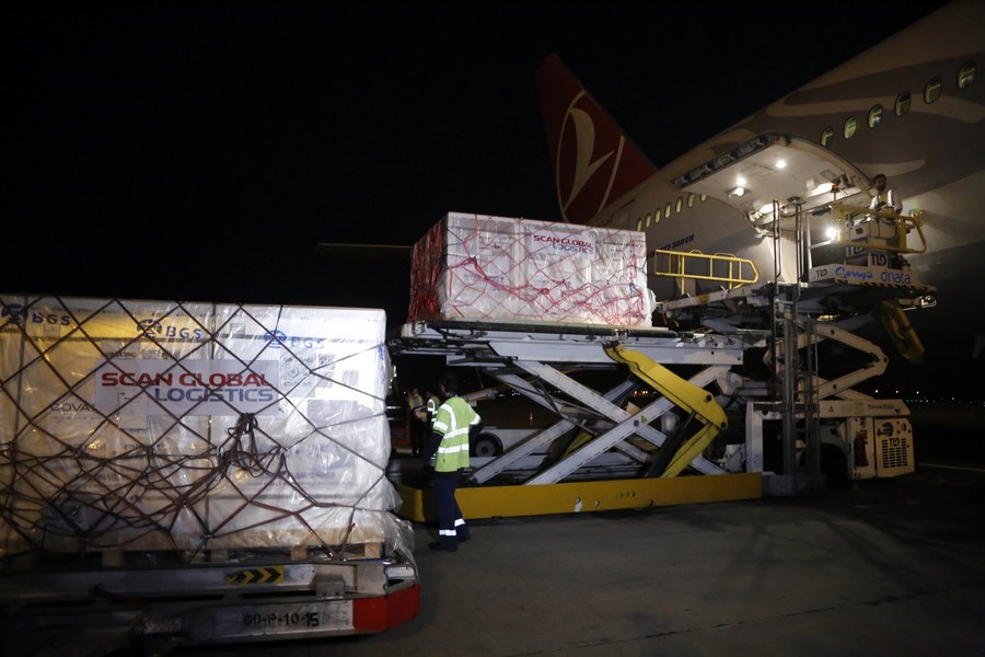 Staff members unload Chinese Sinopharm COVID-19 vaccines at Islamabad International Airport, Pakistan, Aug. 11, 2021. (Xinhua/Ahmad Kamal)