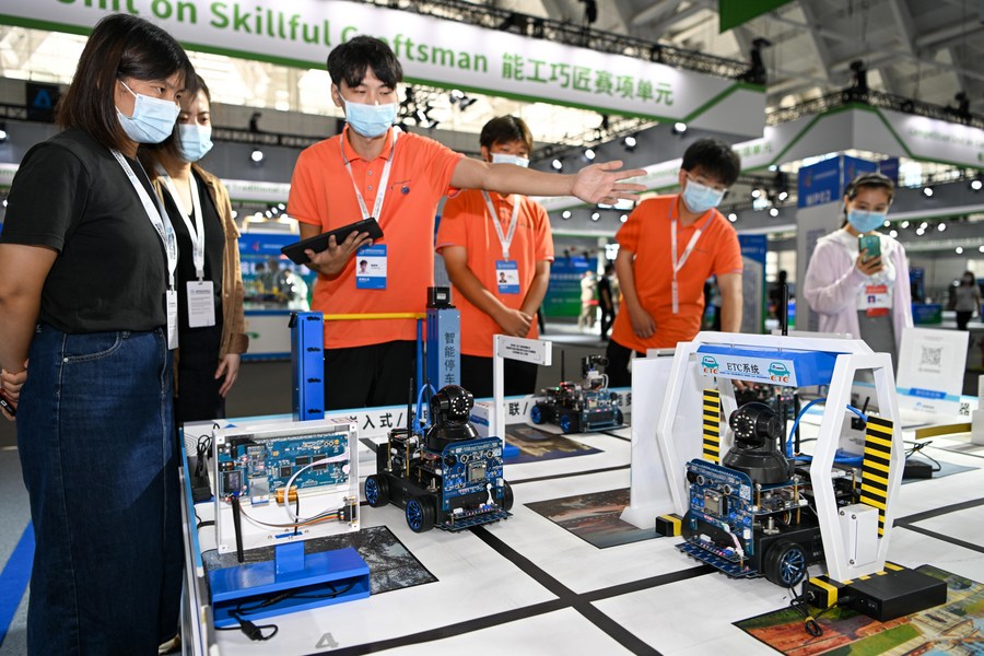 A competitor operates robots during the World Vocational College Skills Competition in Tianjin, north China, Aug. 19, 2022. The competition, as a part of the World Vocational and Technical Education Development Conference, attracted participants from over 100 countries and regions. (Xinhua/Sun Fanyue)
