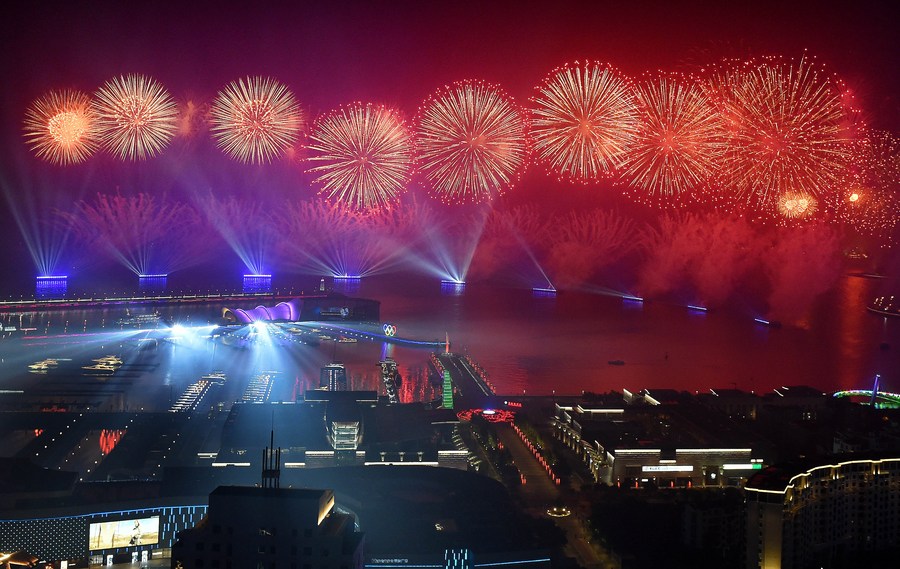 File photo shows a lights and fireworks show in Qingdao, the host city of the 18th Shanghai Cooperation Organization (SCO) summit, east China's Shandong Province. (Xinhua/Li Ziheng)