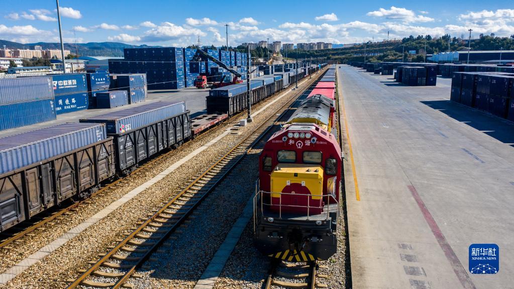 2022年1月1日,满载30个标准集装箱的中老铁路新年首趟国际货物列车停靠在中铁联集昆明中心站(无人机照片)。新华社记者 胡超 摄