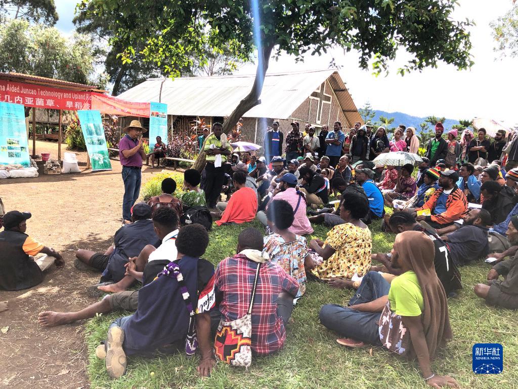 2020年12月15日,中国援巴布亚新几内亚菌草旱稻项目专家组组长林应兴(戴草帽者)在巴布亚新几内亚东高地省中国援助巴新菌草和旱稻技术项目第9期培训班上授课。新华社发