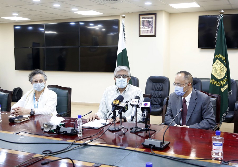 Chinese Ambassador to Pakistan Nong Rong (R) and Special Assistant to the Pakistani Prime Minister on Health Faisal Sultan (C) attend a handover ceremony of Chinese Sinopharm COVID-19 vaccines shipped via the COVAX facility in Islamabad, capital of Pakistan, Aug. 12, 2021.(Xinhua/Ahmad Kamal)