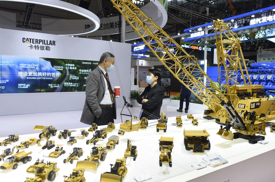 Visitors talk with each other at the Caterpillar booth during the fourth China International Import Expo (CIIE) in Shanghai, east China, Nov. 5, 2021. (Xinhua/Xu Liang)