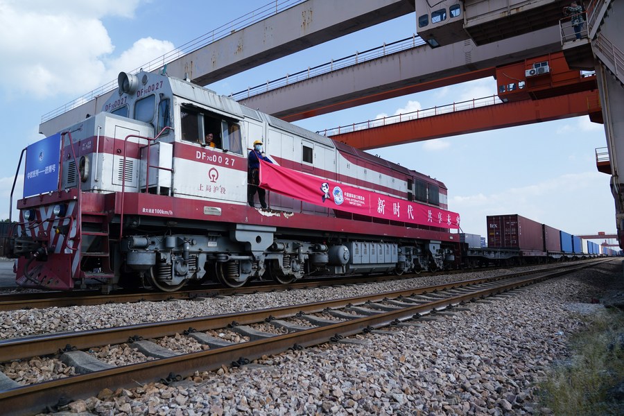 The first "Jinbo" China-Europe freight train is seen upon its arrival in Shanghai, east China, Oct. 29, 2021. Its arrival marks the first time for exhibits of the China International Import Expo (CIIE) to be sent by the freight train to the municipality. (Xinhua/Ding Ting)