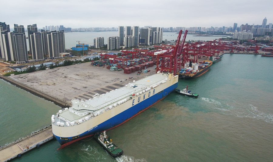 Aerial photo taken on Feb. 16, 2020 shows roll-on-roll-off ship Morning Laura docking at the Xiuying Port, Haikou, capital of south China's Hainan Province, Feb. 16, 2020. Morning Laura is the first ship for automobile trade arriving at Hainan since Hainan free-trade zone policy took effect. (Xinhua/Yang Guanyu)
