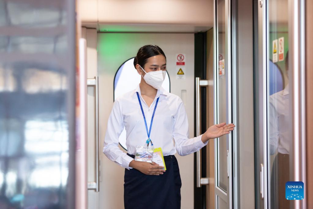 A Lao railway staff member welcomes passengers to board Lane Xang electric multiple unit (EMU) train of the China-Laos Railway at Vientiane Railway Station in Vientiane, Laos, Dec. 3, 2021. (Photo by Kaikeo Saiyasane/Xinhua)