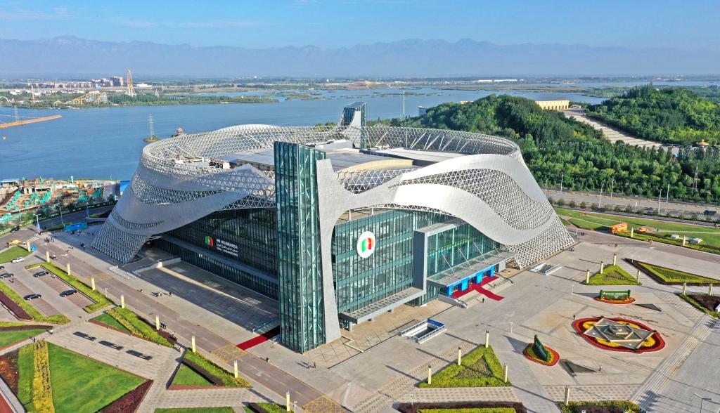 Aerial photo taken on Aug. 19, 2021 shows the main venue of the fifth China-Arab States Expo in Yinchuan, northwest China's Ningxia Hui Autonomous Region. (Xinhua/Wang Peng)