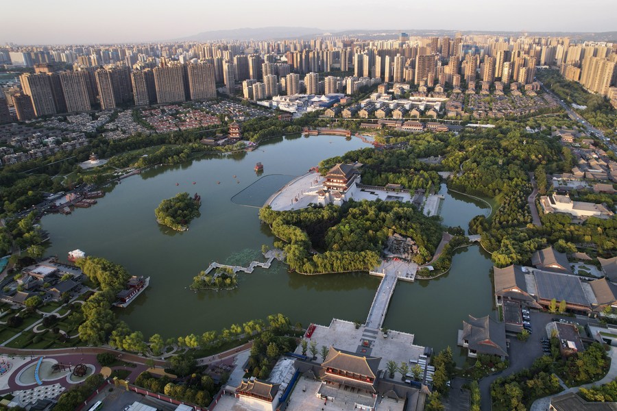 Aerial photo taken on June 15, 2022 shows a view of the Tang Paradise, a large royal-garden-like theme park, in Xi'an, northwest China's Shaanxi Province. (Xinhua/Shao Rui)