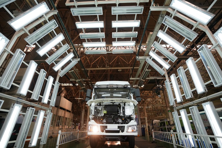 A truck waits for inspection after it is assembled at Shaanxi Automobile Holding Group in Xi'an, capital of northwest China's Shaanxi Province, May 24, 2022. (Xinhua/Li Yibo)