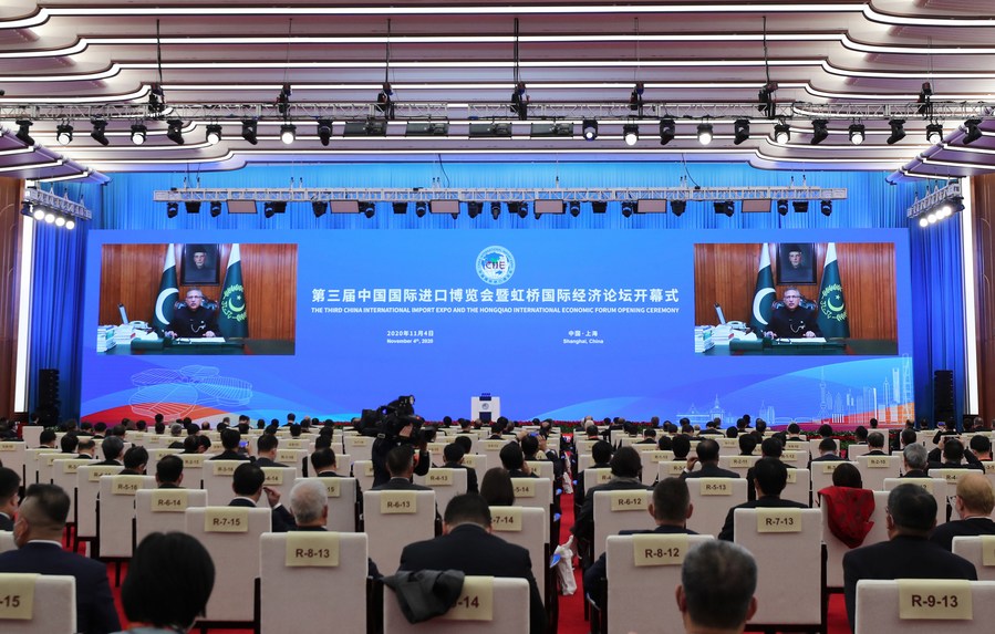 Pakistani President Arif Alvi gives a speech via video link at the opening ceremony of the third China International Import Expo (CIIE) held in east China's Shanghai, Nov. 4, 2020. (Xinhua/Fang Zhe)