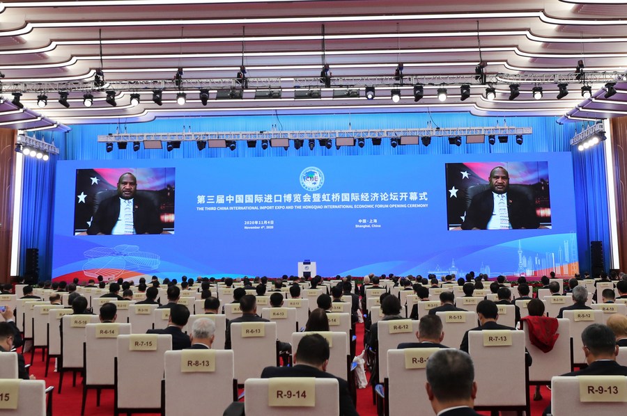 Papua New Guinean Prime Minister James Marape gives a speech via video link at the opening ceremony of the third China International Import Expo (CIIE) held in east China's Shanghai, Nov. 4, 2020. (Xinhua/Fang Zhe)