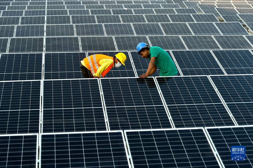 2021年1月3日,在位于孟加拉国首都达卡郊区的利德成集团厂区,工人们在房顶组装光伏模组。从2020年开始,中资制衣类企业——利德成集团在其位于孟加拉国达卡的厂区内建设光伏电站,以降低对传统能源的依赖,减少碳排放,从绿色发展的角度助力“一带一路”建设。新华社发