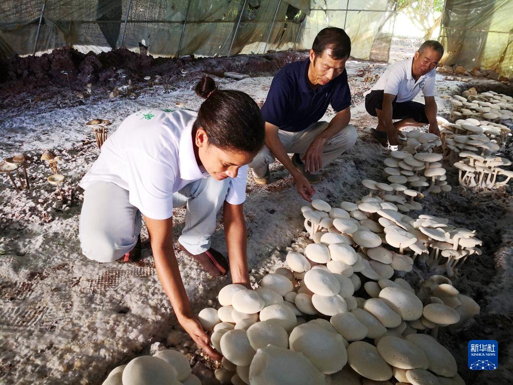 2018年6月12日,在斐济楠迪,中国专家和当地雇员检查菌菇生长情况。新华社记者 张永兴 摄