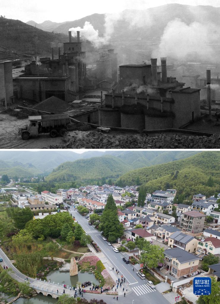 这是一张拼版照片,上图为:浙江省湖州市安吉县天荒坪镇余村二十世纪八十年代的资料照片;下图为:2018年4月24日,游客在整修一新的余村游览(新华社记者 翁忻旸 摄)。新华社发