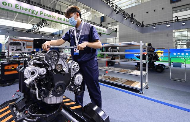 8月19日,在国家会展中心(天津),首届世界职业院校技能大赛的参赛选手在进行发动机拆卸维护展演。 新华社记者 李然 摄