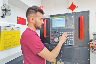 埃及学员在艾因夏姆斯大学鲁班工坊数控设备应用与维护技术实训室学习操作。 沈小晓摄