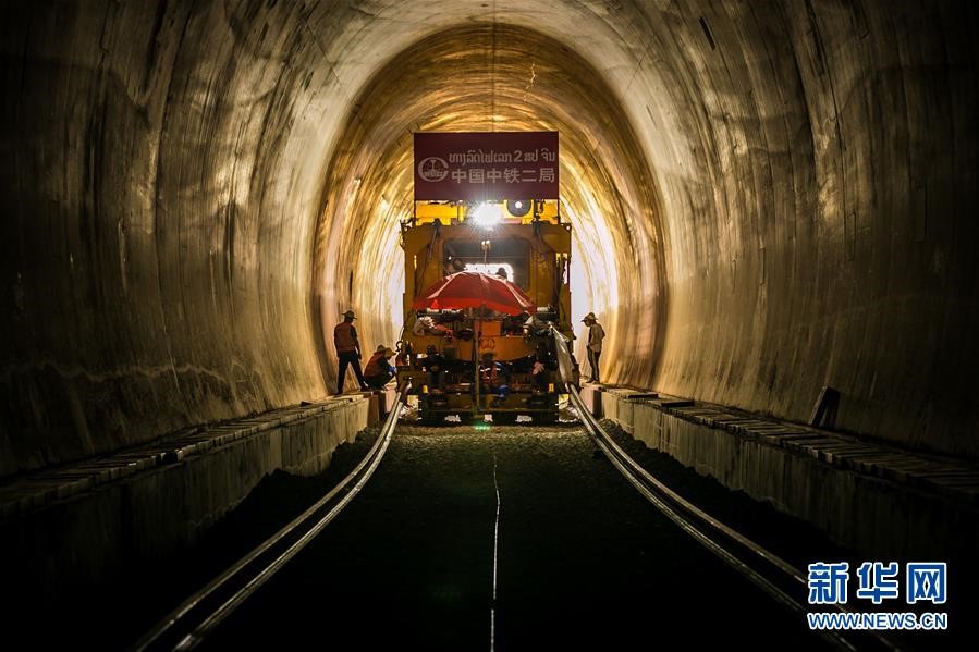 随着每排14根轨枕按照规定距离平稳铺过庚凯村隧道,500米长钢轨随着牵引机稳准落定,中老铁路铺轨23日通过第一座隧道,从老挝首都万象一路向北。 (图片来源:新华社 凯乔摄)